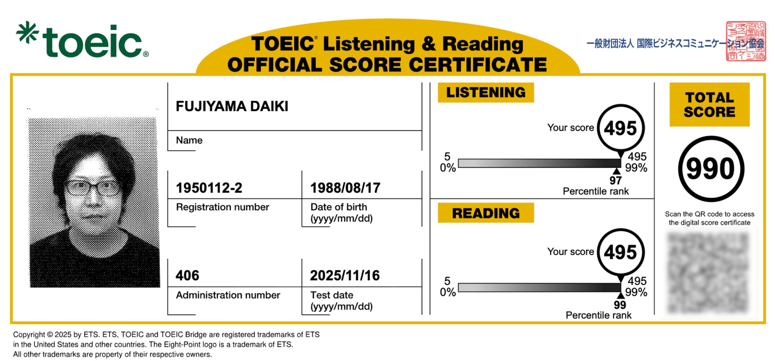 【満点17回目】第406・407回TOEIC(2025年11月16日)の結果が出ました
