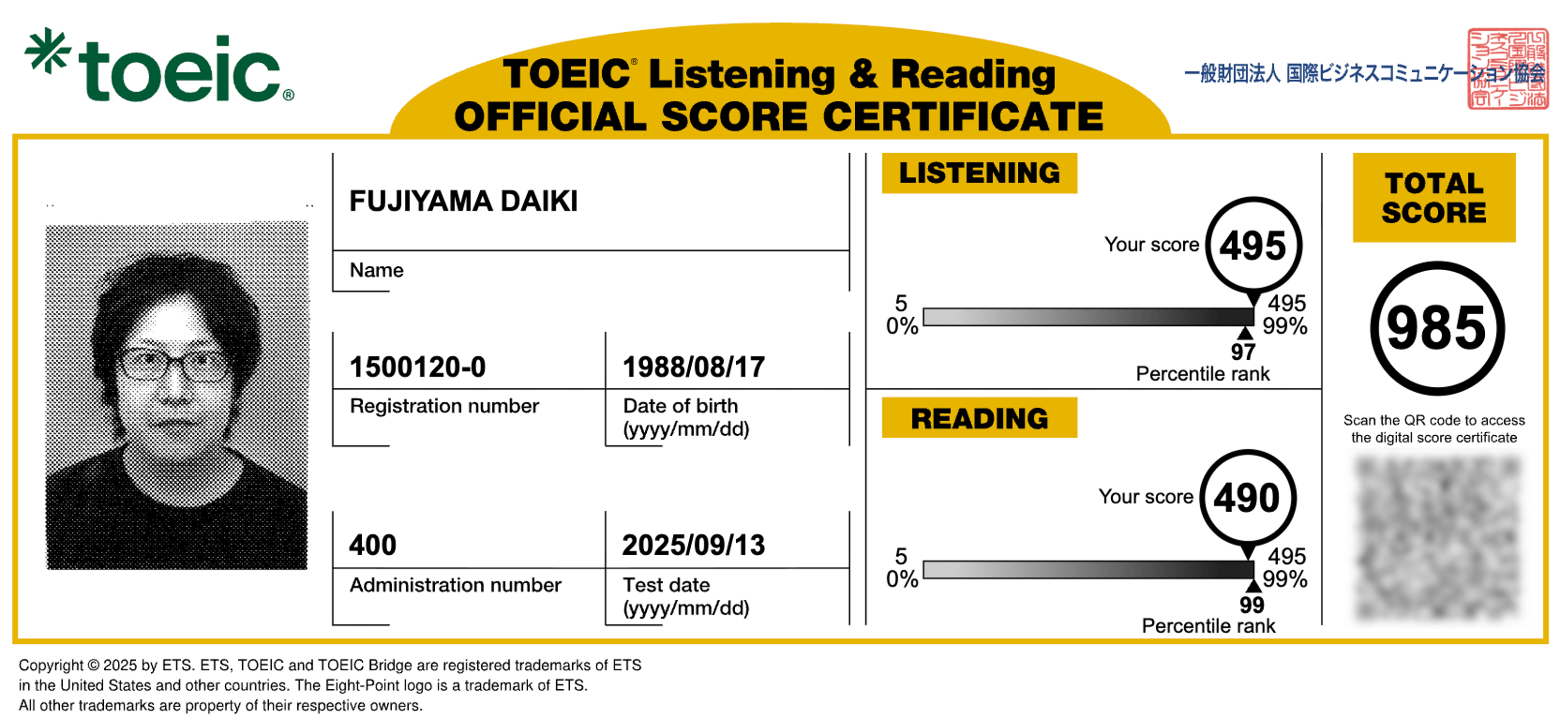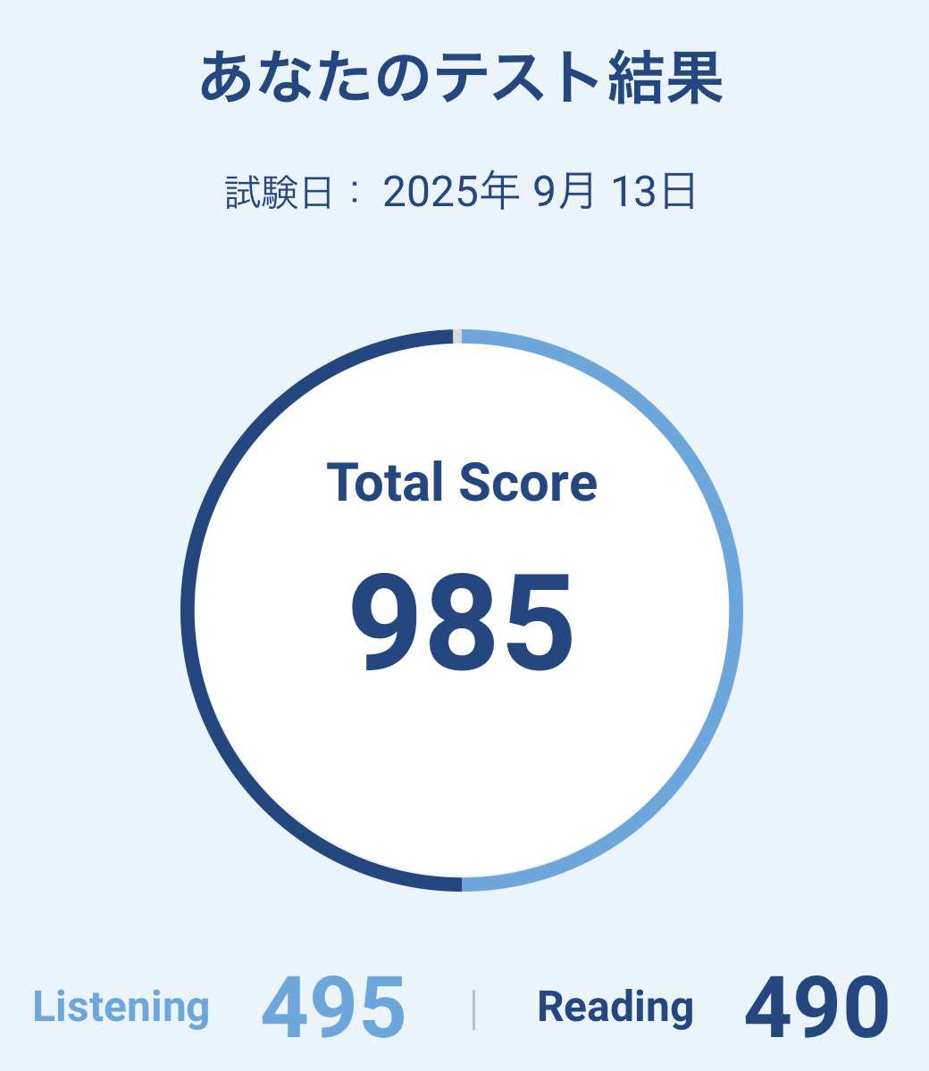 第400・401回TOEIC(2025年9月13日)の結果が出ました